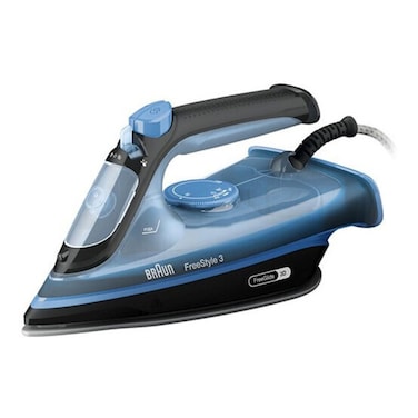 The Braun FreeStyle 3 Steam Iron FI 3194 in Blue and Black is a powerful 2400W iron that will make ironing a breeze. With its sleek design and advanced steam technology, it will effortlessly remove wrinkles from your clothes.