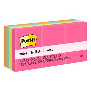 Post-it Notes Neon Colors 653AN. 1.5 x 2 in (38 mm x 51 mm), 100 sheets/pad, 12 pads/pack