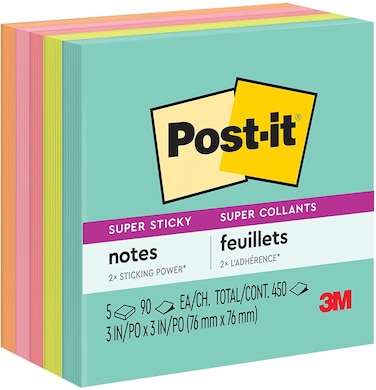 - <p>3 in x 3 in, Miami Collection<p>Post-it Super Sticky Notes stick and re-stick so your thoughts get noticed<p>Reliably sticks so your message or reminder stays front and center<p>Post-it Super Sticky Notes have 2X the sticking power<p>Use for reminders on doors, windows and walls<p>Size:5 Pads<p>Post-it Super Sticky Notes, 3" x 3", Miami Collection, 5 Pads per Pack, 90 Sheets per Pad (654-5SSMIA)