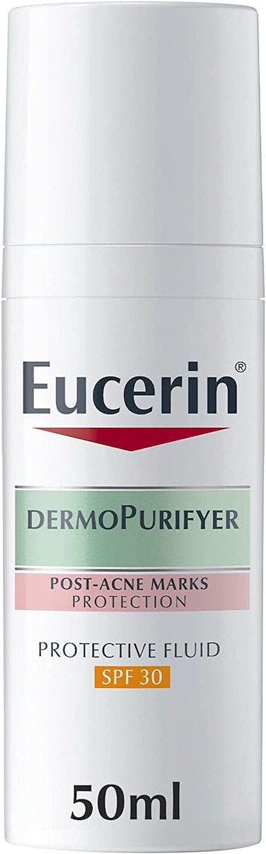 Long after the acute acne has faded, up to 50% of people experience post-acne markings (also known as post-inflammatory hyperpigmentation or PIH), which can last up to 5 years. Acne accompanied by PIH is often more emotionally and physically burdensome than acne alone. Now, thanks to Eucerin, victory is visible. Eucerin DermoPure Protective Fluid SPF 30 is the solution for acne-prone skin with post-acne marks. Formulated with SPF to protect marks from darkening due to sun exposure. This serum is clinically and dermatologically proven to visibly prevent PIH from worsening over time with three main factors: * Anti-marks darkening: SPF 30 UVA/UVB filters protect from sun-induced darkening of post-acne marks and prevent their appearance * Anti-blemish: Featuring two signature ingredients - Antibacterial Decanediol to effectively reduces blemishes and Licochalcone A to soothe irritations * Anti-shine: Sebum regulating technology delivers a long-lasting, dry, matte finish Achieve visible results in just two weeks with continuous improvement over 12 weeks. * Product in use study with 100 volunteers, 8 weeks of regular usage twice a day **Clinical study with 40 volunteers, 12 weeks of regular usage of both Serum & Fluid twice daily. Example shown, individual results may vary.