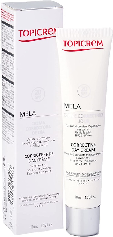 - <li>Topicrem MELA Corrective Day Cream SPF 20 40ml is a day cream created to unify, lighten, correct brown spots and imperfections of sensitive skin.<li>Protected and hydrated, the skin regains radiance and luminosity. Without paraben.<li>Its SPF 20 formula with patented lightning complex, works at the heart of the skin to reduce and lighten brown spots day after day.<li>Apply every morning on the perfectly cleansed face and neck, ideally after the Booster Serum. Indication: To unify, lighten, correct brown spots and imperfections.