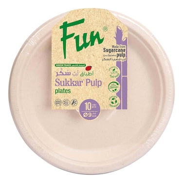 Fun Green Track Sukkar Pulp Round Plates White 9inch 10 PCS are eco-friendly disposable plates made from sugarcane pulp.