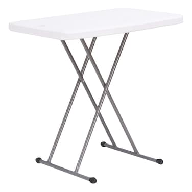 - The HDPE plastic adjustable table folds flat for easy storage and can be set up with ease