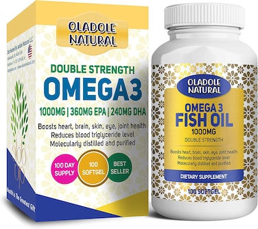 Oladole Natural Fish Oil Omega 3 1000 mg 360 Epa 240 Dha Double Strength, Boosts Heart, Brain, Skin, Eye, Joint Health, Reduces Blood Triglyceride Level, Cardiovascular Support 100 Softgel