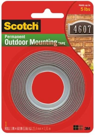 - <p>Use instead of nails or screws<p>High conformability adheres easily to your item and the surface<p>Delivers a strong, permanent bond on contact<p>Holds up to 15 lbs. per 60”/ (1 lb. per 4"of tape)<p>Easy-to-apply design with no mess or tools Ideal for use on finished/painted surfaces, metal, plastic, vinyl and more Intended for outdoor use<p>Scotch® Outdoor Mounting Tape is weather resistant double sided conformable tape. Can be used on a variety of surfaces such as painted cement or brick, glass, metal, tile, ceramic and more. Faster, safer more versatile than screws and nails. Whether you're beautifying the exterior of your home, or reinforcing your mailbox, Scotch™ Outdoor Mounting Tape is the one to choose for a hassle-free, permanent bond. Designed to deliver exceptional adhesion, this powerful double-sided tape holds up to 15 pounds and is weather resistant for permanent mounting. It's compatible with a variety of surfaces and conforms easily.Use instead of nails or screws High conformability adheres easily to your item and the surface Delivers a strong, permanent bond on contact Holds up to 15 lbs. per 60”/ (1 lb. per 4"of tape) Easy-to-apply design with no mess or tools Ideal for use on finished/painted surfaces, metal, plastic, vinyl and more Intended for outdoor useWorks best when applied between 50°-100° FEnsure your surface is smooth, clean and dry for the best bond Made in the USA from domestic and globally-sourced materialsSize: 1 in. x 60 in.Color: Gray