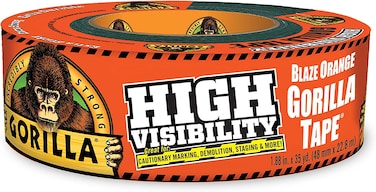 - Double thick adhesive; grips smooth, Rough and uneven surfaces Tough reinforced backing; the tight weave contributes to the strength, but high visibility Gorilla tape can still be torn by hand Rugged, weather resistant shell with UV protection; withstands moisture and helps create a barrier against harsh elements High visibility Blaze Orange; for marking, hunting, demolition and more Gorilla tape, for the toughest jobs on planet earth