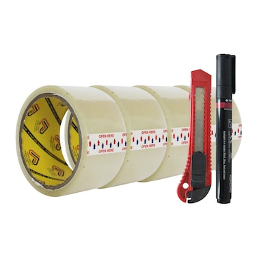 This tape with cutter and marker is perfect for various tasks, whether it's packaging, labelling, or crafting.