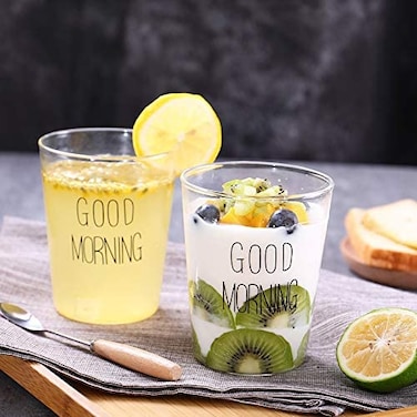 Lushh Set of 2Pcs 400 ML Borosilicate Good Morning Printed Glass for Juice Wine Tea Coffee , Breakfast Cup Cocktail cups for everyday use