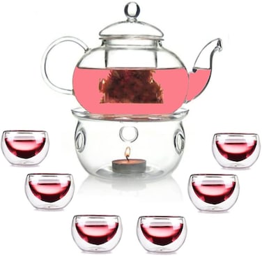 - Borosilicate Heat Resistant Glass Teapot with Tea Warmer and 50 ml Double Wall Glass 6 Pc Set