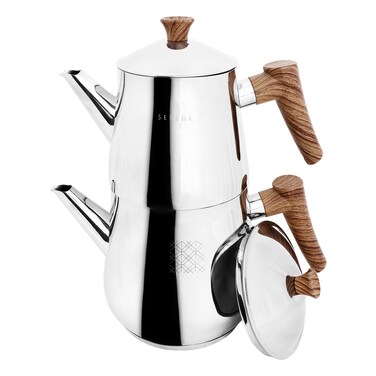 SERENK TURKISH TEAPOT: Serenk tea pot and tea kettle set is made of heavy-duty 18/10 stainless-steel construction which exceedingly resistant to scratches, staining and will maintain its beauty and performance for a lifetime. Elegant polished exterior design looks striking on any stovetopDIMENSIONS: Tea pot: 1.3 qt, tea kettle: 2 qt. height: 11" high with lidTHERMO CAPSULE BASE: This tea kettle for stove top is designed with a generous thermos capsule bottom to have a high thermal conductivity to ensure rapid heating and give a longer lifespan. Our self-sealing lid also offers a 100% seal to increase the efficiency of boilingSTYLISH AND COMFORTABLE BAKELITE HANDLES: Non-slip, heat resistant and comfortable wood effect bakelite handles stay cool and ensure a good grip. It is designed with a safe connection which will keep the handle tight for all timeUSE&CARE: Do not heat while kettle is empty or allow it to boil dry. Dishwasher safe. Avoid using harsh detergents, abrasive cleansers, steel wool or steel scouring pads. Wipe with a damp cloth, then buff with a soft, dry cloth to polish the surface