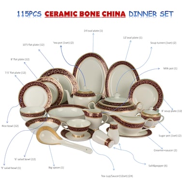 - "Our products cover dinner set, tea set and etc. We have classical compositions 115PCS dinner set. The 115pcs is made of bone china which means extremely high class and luxury, while the 97pcs dinner set, 32pcs dinner set, 24pcs tea set, and 12pcs Tea Cup&Saucer are made of new bone china which is famous for the very good quality and charming models. The various compositions and choices of our items can meet your different demands. The rich and colorful designs with real 24K gold not only are the shining decoration for your table but also the best seasoning help you enjoy every meal in your daily life."