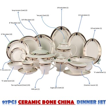 - Our products cover dinner set, tea set and etc. We have classical compositions 97pcs dinner set. The 97pcs is made of bone china which means extremely high class and luxury, 97pcs dinner set includes; 10'5 flat plate- (12) 9' soup plate- (12) 8' flat plate- (12) 6' flat plate- (12) '6' salad bowl- (12) 'teapot (1set)- (1) Teacup/Saucer(12set) -(24) sugar pot (1set)- (2) milk pot-(1) soup tureen (1set)- (2) '9' salad bowl -(1) creamer+saucer - (2) 14'oval plate- (1) 12'oval plate- (1) 10'oval plate- (1), Tea Cup&Saucer are made of new bone china which is famous for the very good quality and charming models. The various compositions and choices of our items can meet your different demands. The rich and colorful designs with real 24K gold not only are the shining decoration for your table but also the best seasoning to help you enjoy every meal in your daily life.