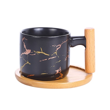 ZK Ceramic mug wooden handle, marble design printed classic coffee enamel mug Ceramic Coffee Cup with wood handle.
