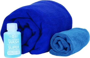 Sea to Summit Tek Towel Wask Kit is a complete travel wash set with bath towel and face cloth in a soft terry cloth and Wilderness Wash soap concentrate. It is highly absorbent polyester / nylon terrycloth fabric that absorbs water and dries quickly. Features hanging loop secured with a snap button and stitched edges. Includes an oval mesh zippered storage bag. Wilderness Wash works as a body wash, shampoo, dish soap, or laundry detergent. Comes in cobalt colour. Size : Large.