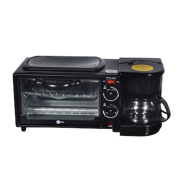 It features a toaster oven, a coffee maker, and a griddle, all in one compact design. The toaster oven can toast bread, bake small dishes, and even broil food.