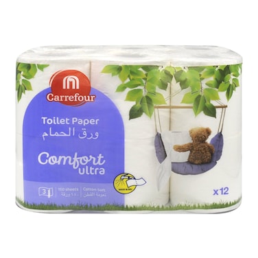 Carrefour Ultra Comfort Toilet Paper Roll White 3Ply 150 Sheets 12 Rolls