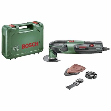 Bosch Corded Multifunction Tool, PMF220CE is ideal for grinding, sawing, cutting and scraping You can preselect the oscillation rate to have control over the tool and the material you are working on This tool is versatile thanks to a wide range of Bosch Starlock accessories You can change the depth using the 4-depth stop It can give high performance even under load due to the Bosch Constant Electronic The powerful 220 W motor gives faster work rate The plunge cut saw blades with Curved-Tec give precise and gentle cutting due to rounded cutting edges 1 BIM segment saw blade for wood and metal of 85 mm, 6 Delta Sanding Sheets, 1 Delta Sanding Plate at 93 mm, 1 HCS plunge-cutting saw blade for wood at 32 x 40 mm, 1 Hex key, 1 Plastic case, 1 4-Stage Depth Stop for Segment Saw Blades