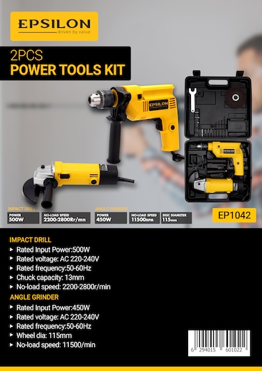 b'Created to simplify and improve a wide range of tasks. Epsilon offers you a 2-piece power tool kit, which includes an impact drill and an angle grinder packed with multiple utility features