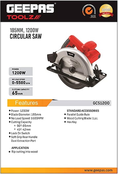 - <p>185mm Circular Saw<p>Power: 1200W<p>No Load Speed: 5000rpm<p>Cutting Capacity: 65mm at 95 Degree, 42mm at 45 Degree<p>Lock on and off Switch
