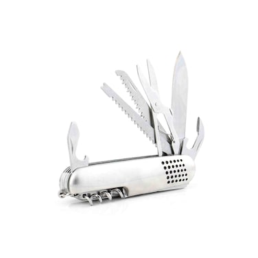 It features 15 different tools, including a knife, saw, screwdriver, and bottle opener, all conveniently packed into a sleek silver design.