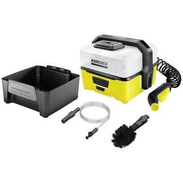Karcher Mobile Outdoor Cleaner Pressure Washer, OC3 + Adventure Kit lets you clean your equipment on the go Compact machine design with convenient storage of the spiral hose and trigger gun under the removable water tank Has integrated lithium-ion battery that offers long battery runtime Low pressure offers the advantage that cleaning is both efficient and extremely gentle at the same time Standard nozzle with flat spray enables visible cleaning performance Adventure kit includes a universal brush, a suction hose & an accessory box Universal brush with soft bristles attaches to the gun to remove stubborn dirt Suction hose lets you the use alternative water sources such as canisters or wells Accessory box easily attaches to the device for storage You can clean your bicycle, garden equipment, stroller, shoes, pets, camping equipment and more with it Pressure range: Low pressure; Battery charging time: 180 minutes; Weight without accessories: 2.2 kg