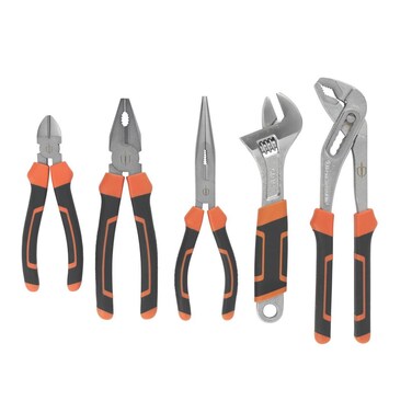Set includes 1x160 mm diagonal cutter with Flat Shape Jaw, 1x200 mm combination pliers with Clamp Shape Jaw, 1x200 mm long nose pliers with Flat Shape Jaw, 1x250 mm slip joint pliers with Clamp Shape Jaw, 1x200 mm adjustable wrench with Clamp Shape Jaw, Carry Pouch 600 mmX300 mm