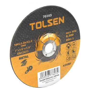 <li><b>Tolsen Depressed centre cutting-off wheel Cutting disc for metal<li>Long lifetime<li>Comfortable cutting behaviour<li>Easy cutting<li>It is efficient.<li>SPECIFICATIONS<li>Item Name Cut-Off Wheel<li>Model 76143<li>Brand Tolsen<li>Colour Black and Yellow<li>Size 125 x 3.0 x 22mm<li>RPM (no load) 12250<li>Brand Origin (not manufacture) China<li>Packing Quantity 1<li>Unit Piece