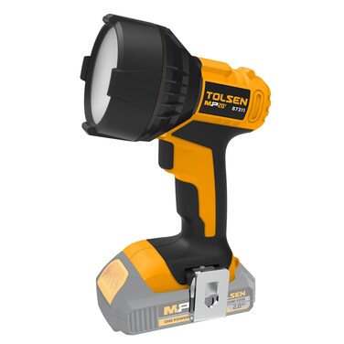 - Battery pack voltage: 20V LED power: 10W Lumens: 1000Lm (100%) / 500Lm CCT: 6500K (Daylight) Working time:3h(20V/2.0Ah) CE approval Soft grip Belt clip 3 Model shift: 1000lm, 500lm, SOS, Off *Battery/charger not included Packing: color box