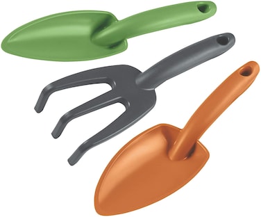 Made with heavy-duty polypropylene, they last longer and have a beautiful finish. - The handles have an ergonomic shape for a more comfortable use. - Lightweight products that demands less physical effort from the user, resulting in more pleasant work. - Contains 3 pieces: 1 hand garden trowel (78108/011), 1 cultivator 3 teeth (78108/024) and 1 transplanting trowel (78108/000). - The packaging purpose is to easily display the goods in the point of sale.