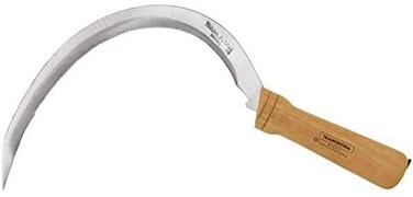 The grass hook is completely hardened which guarantees greater strength and lower wear during use. - Produced with high-quality, special carbon steel. - The blade with teeth and varnished finish and your sharpened guarantees a long-lasting edge. - This 13 cm tool's shaft is highly resistant and produced with wood from renewable sources. - Handle with a varnished finish for a better appearance. The transparent varnish protective layer enhances the color and adds shine and a smooth touch to the product.