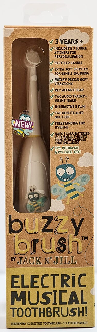 Jack n' Jill buzzy brush musical electric toothbrush has soft DuPont nylon bristles, very gentle rotary action, and a sing-along instructional song. The head is replaceable, the handle is non-toxic and recyclable. There are 3 modes with memory function means buzzy will revert to the setting used previously. The brush can be personalised by using the adorable bubble stickers supplied.