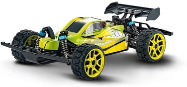 Fast driving pleasure. One thing is certain: this speedster stands out. The Carrera RC Professional Mint Maxx attracts attention with its bright green and yellow paint and the large, air-filled tyres. With extreme speed of up to 50 km/h and a driving time of up to 15 minutes, no one can compete with this Powerbolid. The racing car with four-wheel drive is fully suspension and splash-proof, so that even difficult and wet race tracks do not harm it. This Carrera RC professional vehicle is ready to run and the battery is recharged in 70 minutes. In addition, 2 x AA batteries are included. The Mint Maxx in 1:18 scale is equipped with oil pressure shock absorbers and metal gears - so it has everything it needs to win. 14 years and up.