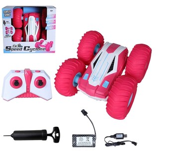 1x Speed Cyclone RC car, 1x Remote control, 1x Pump Perform 360⁰ spins and flips Oversized air-pumped tyres for stunts Full-function radio control Frequency: 2.4GHz Range: 20m Stylish toy car for racing action. This action-packed stunt car has oversized wheels made for 360⁰ spins, jumps and flips. Nothing can get in its way. Flip & Spin With a sleek design and massive inflatable tyres, the Speed Cyclone remote control stunt car is made for extreme action. Bump the Speed Cyclone toy car against any wall to perform dramatic backflips. Flip over obstacles just by hitting the brakes