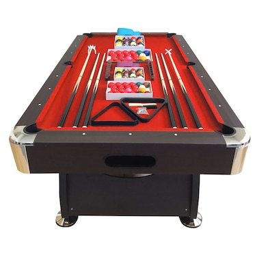- VINTAGE RED – Professional Billiards pool table brown with red carpet and chrome-plated corners. Table size: 8 feet (playing surface 220 cm x 110 cm). Stylish and ideal to embellish even living rooms / offices. Ideal for pleasant evenings with friends. PACKAGE SIZE: 1 BOX – 240 CM X 148 CM X 23 CM – WEIGHT 154. SPECIFICATIONS: Size: 249 cm length x 137 cm width x 80 cm height, Pocket diameter: 10 cm, Adjustable feet to level the table, Automatic ball return system on the short side. ACCESSORIES INCLUDED IN THE PRICE: 15 Numbered Balls with Cue Ball, 15 Red Balls with Cue Ball, 6 Balls of different colours, 6 cues (4 Cannon and 2 Rest shafts with rest head), Scoreboard, Pool Table Cover, Brush to clean the Cloth, 2 chalks. EASY TO ASSEMBLE WITH THE ILLUSTRATED INSTRUCTIONS INSERTED IN THE BOX, IT WILL TAKES AROUND 20 MINUTES.