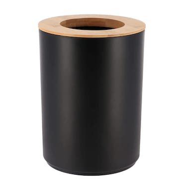 NATURAL DESIGN: The color combination of black and bamboo of this bathroom trash can PADANG will blow a natural wind to your home décor! Also available in black and bamboo EASY CLEANING & BAG CHANGE: By removing the lid, cleaning the waste bin is really easy. It fits regular plastic grocery bags or small trash bag 1.2 Gallon. Perfect size for small compact areas to dispose of small items of rubbish COMPACT SIZE: With its 5 liters or 1.3-Gal capacity, this trash can is ideal for bathroom, kitchen or office use. With a diameter of 7.2" and a height of 9 3/4", this wastebasket fits easily in rooms with limited places HANDS-FREE TRASH CAN: The open top releases your hands, no need to lift the lid to dispose garbage, it’s an easy trash disposal for under sinks, bathroom cabinets, kitchen benches and other small spaces MATCHING COLLECTION: Complete your bathroom decoration with this Padang collection, featuring a toilet bowl brush, a tissue box cover, a soap dispenser or a tumbler to name a few