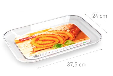 This transparent plastic serving tray provides good value for money! The shape of the tray is simple and strong with slightly raised edges. The high quality transparent plastic doesn't just give it a luxurious look, but also makes it sturdy. Dimensions: 37.5 x 24 x 2.5cm. Made in Spain