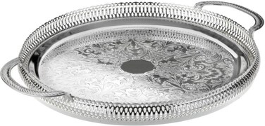 Ideal for serving food or drinks, count on Queen Anne Round Gallery Tray With Handles to add an element of sophistication to your dinner or buffet table. It comes with a floral etching on its surface and a raised beaded rim on the edges. It is a great for help for entertaining guests at home, with the handles of the tray making it easy to serve food and drinks.