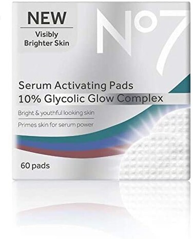 - Product description Details No7 Serum Activating Pads - Exfoliating facial pads supercharged with serum power. Enriched with a 10% Glycolic Glow Complex that gently exfoliates to remove dead skin cells and reveal immediately brighter, more radiant, visibly younger-looking skin. Fine lines and wrinkles appear instantly smoothed while the skin is primed and prepped for serum application, actively helping to increase serum absorption in the skin. No7 Serum Activating Pads are enriched with a Glycolic Acid Glow Complex, containing both AHAs and BHAs, to gently exfoliate skin and remove dead skin cells. Instant Results - Visibly Brighter Skin Instantly skin appears visibly brighter, clearer and more even, for a healthy and youthful glow. Long Term benefits - Primes Skin for Serum Power Lines and wrinkles appear smoothed, while the Skin's surface is prepped and primed for serum application, promoting even better long-term age-defying results. In just one week women saw even better age defying results from their serum. How to use nightly after cleansing. Apply 1 pad to the face in circular motions, avoiding the delicate eye and lip area. Do not rinse away, let the liquid absorb into skin. Follow with your usual No7 serum and moisturiser. Always use an SPF day cream as part of your morning routine prior to sun exposure. Always close the lid tightly after use to prevent pads from drying out.