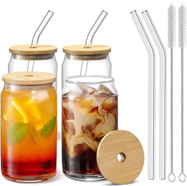 • Drinking glass set includes 2 can-shaped glass cups ,2 bamboo lids and 2 reusable glass straws with cleaning brushes, Classic design, Very practical combination suit.