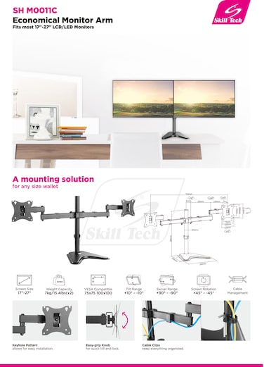 - <li>Product CATegory: Monitor Stand<li>Rank: Economy<li>Material: Steel<li>Surface Finish: Powder Coating<li>Color: Matte Black<li>Dimensions: 913x280x465mm (35.9″x11″x18.3″)<li>Fit Screen Size: 13″-27″<li>Fit Curved Monitor: No<li>Screen Quantity: 2<li>Weight Capacity (per screen): 8kg (17.6lbs)<li>VESA Compatible: 75×75,100×100<li>Tilt Range: +45°~-45°<li>Swivel Range: +90°~-90°<li>Screen Rotation: +180°~-180°<li>Arm Full Extension: 399mm (15.7″)<li>Pole Height: 465mm (18.3″)<li>Installation: Freestanding<li>Instruction Manual Included: Yes