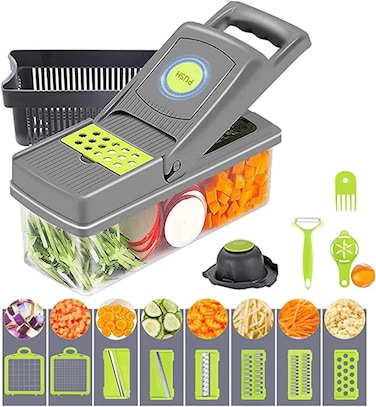14 in 1 kitchen gadgets Commodity information Product size: 13.2*3.9*4.9in Packing size: 14.2*4.3*5.3in Weight: 1.9 pounds Material: stainless steel +ABS Color: green + gray Functions: Shred, slice, cut flower slices, dice, cut strips, grind garlic, peel, separate egg white, drain water, guard hand, one-click cleaning Detachable blades for grating, slicing & dicing 2 * dicing blades: 14 * 14mm, 7 * 7mm 2 * slicers: 1mm & 1.5mm thickness 1 * fine grater: 3mm 1 * grater: 4mm 1 * wavy slicer: ideal for preparing potatoes or zucchini or squash for fries or even cabbage for slaw 1 * coarse cheese grater: great for cheese and garlic Multi-purpose With this onion chopper, you can easily cut strips, large cubes, small cubes, thin slices, thick shreds, flower slices, thin slices, thick slices, and minced garlic. You can also peel food easily and separate egg whites. Please pay attention to your hands when you exchange the blade, as the blade is sharp.