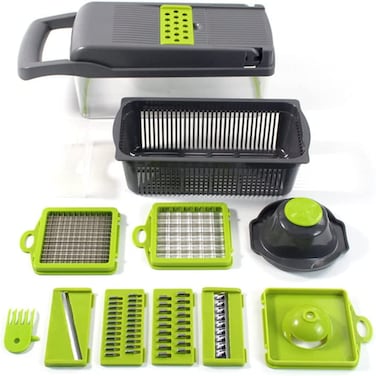 Multi-function Vegetable Chopper: Chop, Dice, Slice and Grate All in One. Designed for ease of use and durability. The blade can flexibly and conveniently cut, slice, shred and shred fruits and vegetables of various shapes and sizes. Onions, mushrooms, cucumbers, carrots, potatoes, tomatoes, ginger, garlic, cheese, etc. The Rekelaisi multi-function vegetable cutter is made of durable, impact-resistant ABS plastic, Therefore, it can withstand the harsh test of a busy kitchen. The interchangeable dice blades are made of durable, rust-resistant stainless steel. They can handle the hardest potatoes and the crunchest carrots without bending over. Cook and prepare faster.Designed to help you cook and prepare faster and more conveniently. Our onion chopper makes your work in the kitchen easy and enjoyable again. Use the small tool provided for cleaning. For your protection and safety, please do not let your fingers touch the blade. Packing: 2 x Cutter Blade (Large Dicer 12x12mm & Small Dicer 6x6mm) 3 x Grater Blades ( Julienne 4 mm & Fine Julienne 3 mm & Wave Slicer ) 1 x Slicing Blade (Smooth Slicer 2mm) 1 x Turmeric Grind Flakes(Garlic Grate) 1 x Gauntlets (Safety Holder) 1 x Egg separator 1 x Storage Container 1 x Drain Basket 1 x Press Plate 1 x Cleaning Claw Warm Note: 1. Make sure that the vegetables and fruits are smaller than the frame of the blade. Otherwise, some hard vegetables may stick to the blade. 2. When there is one third of the remaining vegetables, please use the hand guard to avoid hurting your hands. Wash and dry in time after use to prevent the metal from rusting. 3. Hard and large fruits or vegetables, such as apples or potatoes, need to be cut into quarters or halves before putting them in.