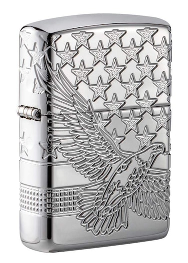- The bald eagle is featured once again on this High Polish Chrome lighter. This time with an even better design. The eagle and American flag background wrap entirely around this lighter. The design is completed using the 360° MultiCut process.Comes packaged in a gift box. For optimal performance, fill with Zippo lighter fuel. Genuine Zippo windproof lighter with distinctive Zippo "click" All metal construction; windproof design works virtually anywhere Refillable for a lifetime of use; for optimum performance, we recommend genuine Zippo fluid, flints, and wicks Made in USA; Lifetime guarantee that "it works or we fix it for free™" Fuel: Zippo lighter fuel (sold separately)