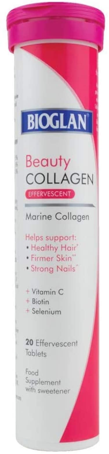 Product Description: Product Description Bioglan Beauty Collagen - 20 Effervescent tablets- 1000mg Hydrolysed Marine Collagen per serve, delicious berry flavour drink Ingredients Acid (Citric Acid), AcidityRegulator (Sodium Hydrogen Carbonate),Hydrolysed Fish Collagen, BulkingAgents (Isomalt, Maltodextrin), Colour(Beetroot), Flavourings (Strawberryflavour, Raspberry flavour), Sweetener(Sucralose), Stabiliser (PolyethyleneGlycol), L-Ascorbic Acid (Vitamin C),Sodium Selenite (Selenium), D-Biotin Directions 2 Tablets per day. Dissolve 1 Tablet, twice daily, in a glass of cold water to make a pleasant berry flavoured drink. Box Contains 20 x Effervescent Tablets