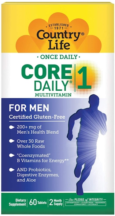 • <p>200+ mg of men health blend<p>Over 30 Raw Whole Foods '<p>Coenzymated' B Vitamins for Energy<p>Probiotics, Digestive Enzymes and Aloe<p>Promotes prostate health<p>Product Description:</p><p>Country Life's Core Daily One line makes taking daily supplements even easier. With just one easy to swallow tablet, you get more than just a simple multivitamin. Core Daily One Multivitamins contain Probiotics, Whole Foods, Aloe, B Vitamins, enzymes and more. Instead of 6 different pill bottles and boxes, it's just one comprehensive tablet to help you with versatile, across the board nutritional support.<p>Set Contains:<p>1 Bottle of Country Life Core Daily -1 for Men Tablets 60's