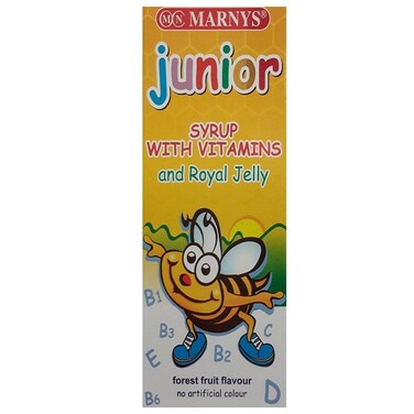 Marnys Junior is a multivitamin syrup with Royal Jelly and a pleasant forest fruit flavour. Contain vitamins A, C, thiamine (B1), riboflavin (B2), niacin (B3), pantothenic acid (B5), B6, B12, D, E, folic acid and biotin.