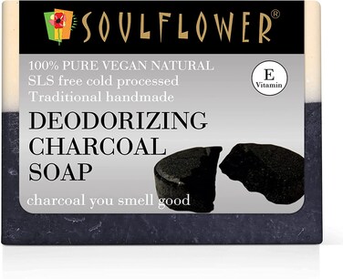 Product Description: Handmade deodorizing charcoal soap from india's 1st preservative free & 1st environmental, social, and governance esg beauty brand. Soulflower deodorizing charcoal soap is 100% pure, natural, vegan, handmade, and cold processed, which is also free from sls, chemicals, synthetic color, or fragrance. Handmade deodorizing charcoal soap is made from activated charcoal powder, vitamin e, fresh radish juice, essential oils of peppermint and tea tree and oils of olive, coconut, castor & palm. Soulflower deodorizing charcoal soap is freeing your skin from dirt, oil, and impurities and fights body odor. Handmade deodorizing charcoal soap hydrates your skin and also lightens, brightens and energizes your skin with an earthy and fresh aroma. Soulflower handmade deodorizing charcoal soap reduces acne marks, skin blemishes, the appearance of blackheads. Deodorizing charcoal soap draws out skin impurities, removes body odor and cleanses the skin. Cold processed deodorizing charcoal soap is perfect for dry to combination skin types. Soulflower deodorizing charcoal soap decreases the appearance of wrinkles and fine lines. Essential oil soap