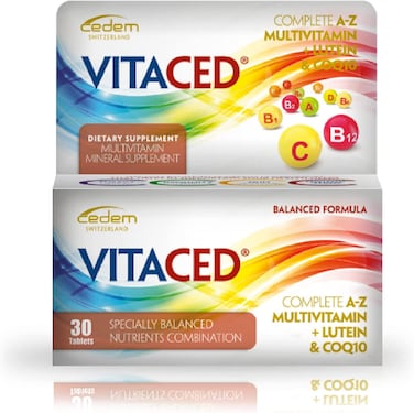 VitaCed Complete A-Z is a daily multivitamin food supplement that contains a combination of 27 vitamins, minerals, and trace elements, in addition to Lutein & COQ10. It supports overall health with Vitamin E, Zinc, Coenzyme Q10, and Selenium especially working to boost immunity and protect the body's cells. In addition, Lutein functions as a light filter protecting the eye tissues from sunlight damage.