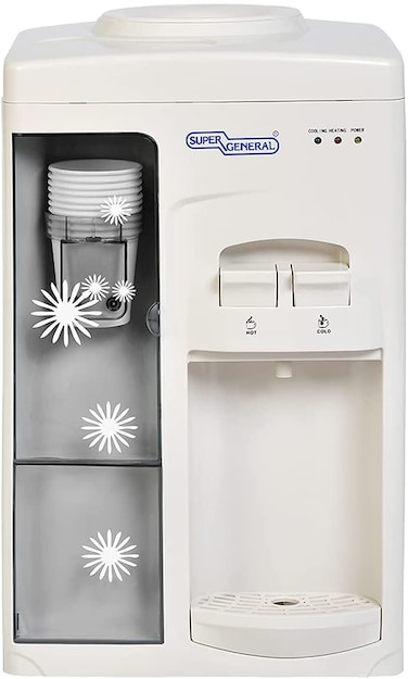The Water Dispenser: Sleek and stylish, the Super General SGL 1131 compact Water-Dispenser provides instant hot and cold water from a single faucet. High-quality Stainless-steel water-tank withstands heavy gallons of water. Thanks to the light-weight construction and sleek design, this efficient water-cooler can be placed everywhere in the home, office, gym, studio, restaurant, bar, hotel or shop. In a nice, white and a semi-glossy finish with floral design and Super General brand logo in blue.