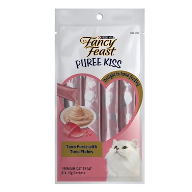 Purina Fancy Feast Puree Kiss Tuna Puree with Tuna Flakes Cat Treat, 10g Pack of 4